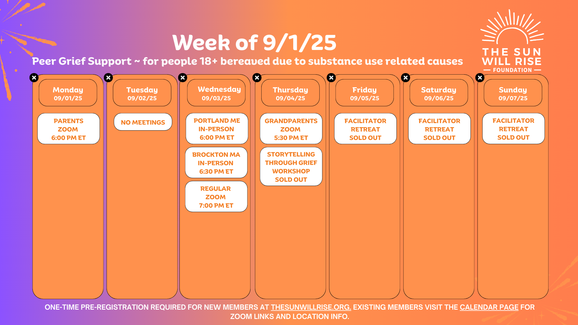 New event! HEALING THROUGH LAUGHTER, PLAY & GAMES Saturday 11/1/25 10am-5pm. Weymouth MA. Register Required. Our storytelling virtual workshop was such a hit that we brought award winning Meghann Perry back for a full day in-person event! Our bodies, hearts and voices hold and carry so much for ourselves and for others. Spend the day with others in our grieving community. There will be time to play, relax, connect with self and others. We’ll be using theater improv and storytelling exercises but don’t worry - you won’t be on the spot! The Embodied Storytelling method is a gentle, easy, no-pressure series of group exercises. Tap into your inner healer through an essential part of human nature - play - to relax, connect with self and others through joy, and release tension and weight. REGISTER HERE Cost: FREE but requires a $20 per person deposit that you will receive back at the event. If you sign up and do not attend the event without giving us 10 days notice, the deposit is not refundable. We do this to be able to continue to offer events at no cost to you. Thanks for your understanding. Please don’t let the deposit be a barrier—if cost is an issue, just let us know. We’re committed to making this event accessible to everyone. If you have any accessibility needs (physical or otherwise), please reach out. We want to ensure everyone feels welcome and supported. Questions? Email robyn@thesunwillrise.org