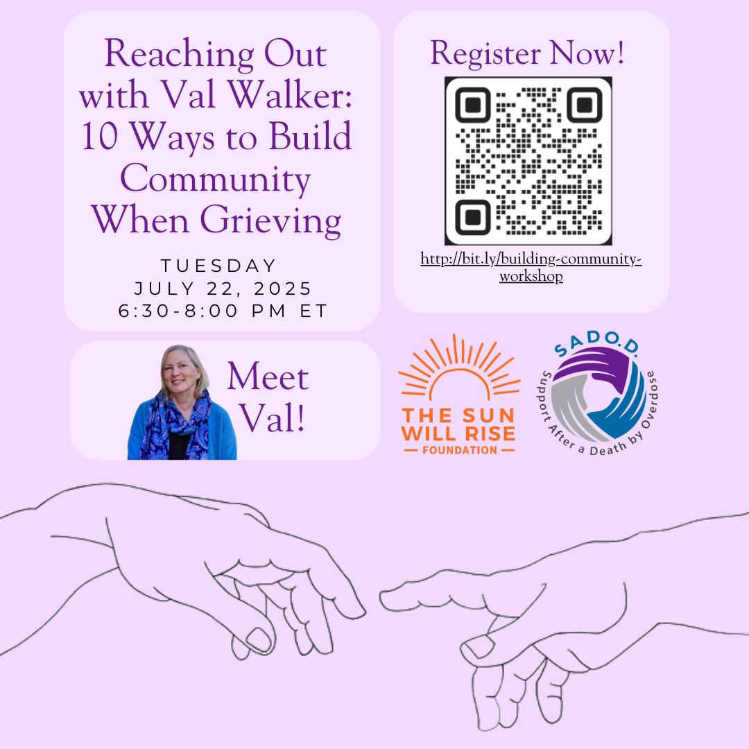 SADOD’s July PSYCHOEDUCATIONAL WORKSHOP Reaching Out with Val Walker: 10 Ways to Build Community When Grieving Tuesday 7/22/25 6:30pm ET In uncertain times, such as when we are grieving, many of us are asking: “How do I make new connections?” Author, bereaved person, rehabilitation consultant, and Psychology Today blogger, Val Walker, will lead a discussion where we will share ideas and real-life success stories of how we can expand and enrich our social life. This workshop will take place virtually on Zoom. Learn more and register at bit.ly/building-community-workshop. Please note this workshop has a $10 fee for individuals outside of Massachusetts. Massachusetts residents may attend this workshop for free due to funding from MA-BSAS by using promo code MASS at the time of registration. If cost is an issue, please contact Laura@sadod.org