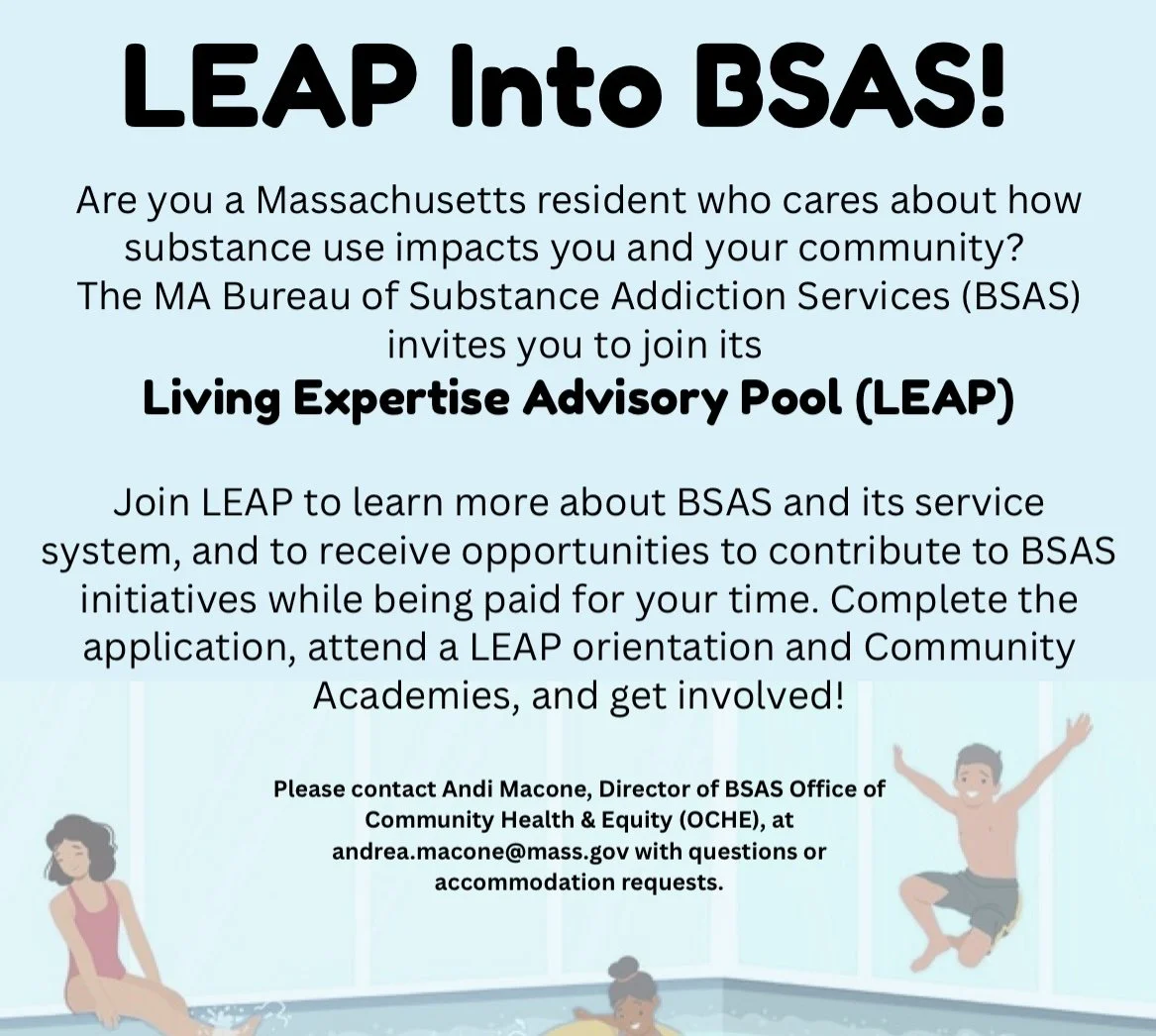 LEAP serves as a statewide body of community members, residents, and professionals who want to contribute lived and living experience to work happening at the Massachusetts Bureau of Substance of Addiction Services (BSAS). LEAP members will be invited to learn more about what happens at BSAS and across our system of services, and may receive paid consultation opportunities as a way of ensuring that community voice is represented in our decision-making. You can join LEAP by completing this application, which allows you to choose which experiences and identities inform your perspective. All responses except contact information are optional, and will be securely stored with only OCHE staff able to view the information you share. After attending orientation and relevant Community Academies, you’ll be eligible for matching with BSAS projects where your expertise will provide valuable insights.