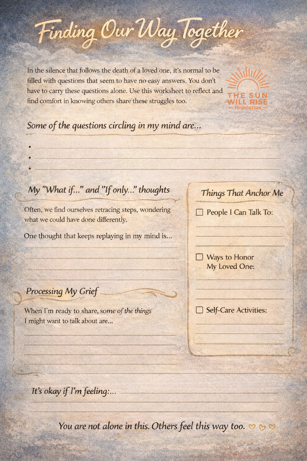 The silence that follows the death of our person is rarely quiet in our own minds. Instead, it’s often filled with a relentless cycle of questions that don’t seem to have easy answers. Some of us find ourselves retracing steps, trying to reverse the tragedy, wondering "what if" or "if only," and trying to make sense of a death that feels both preventable and inevitable all at once. It is a heavy, complicated weight to carry. There is no right way to process this. Just know that others have these questions circling their minds too. Whether you need to talk through the hardest memories or share a moment of joy, our groups can be your anchor. You don't have to carry the weight of these questions alone.