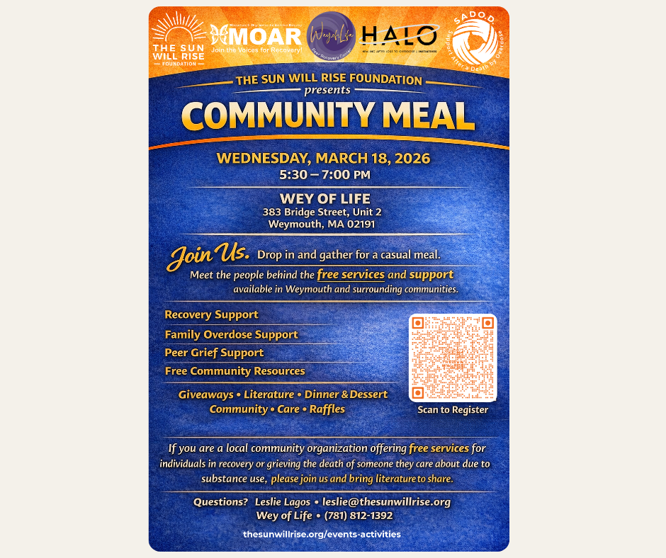 Community Meal Wednesday, March 18, 2026 5:30 PM 7:00 PM Wey of Life 383 Bridge St Unit 2 Weymouth MA Join us for a Community Meal to meet the people behind the free services and support available in Weymouth MA & the surrounding communities. Give-aways - Literature - Dinner/Dessert - Community - Care - Free Services - Support - Raffles All ages welcome Registration appreciated but not required (we’d like to prepare for the meal.)