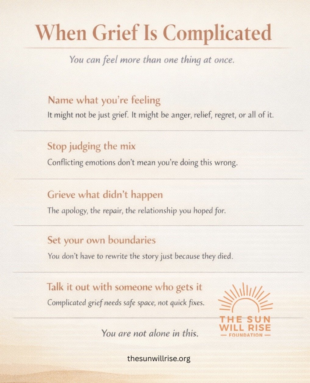 We don’t talk about this one enough. Sometimes the relationship you had with the person who died was difficult. Maybe it was not what you needed. And then they die and nothing is resolved and it still hurts. It can feel confusing. There can be sadness mixed with anger. Or relief that brings guilt with it. This is because you’re not just grieving the person who died. You’re also grieving what the relationship was or what it never got to be. If that’s where you are, nothing about it is wrong. It’s just real.